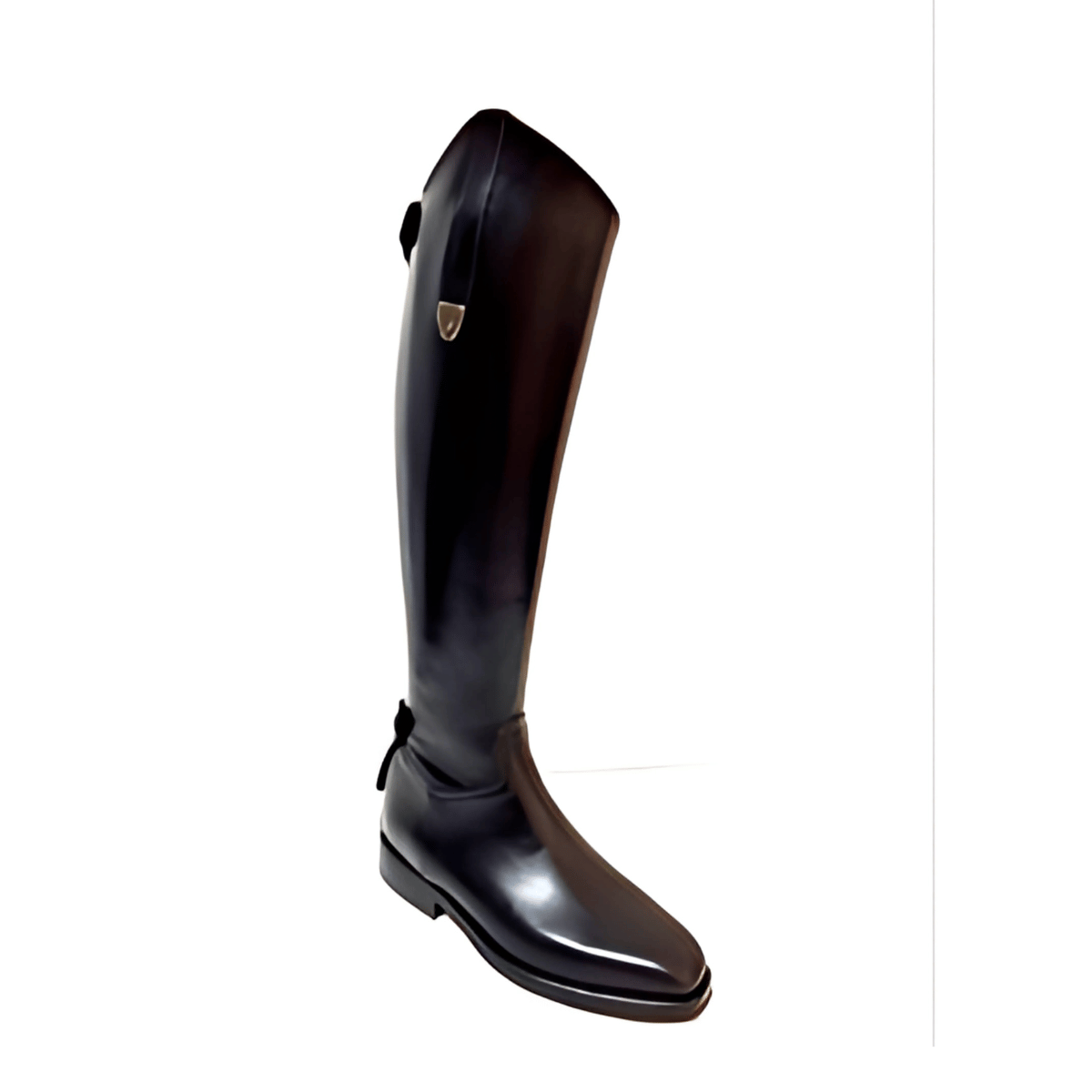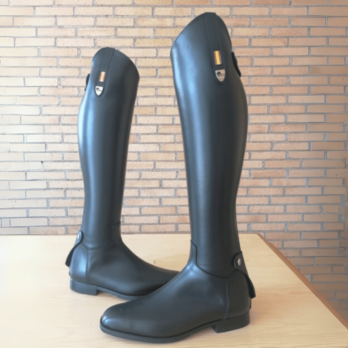 Bota de doma ‘Calpe’ con distintiva puntera cuadrada. Elegancia tradicional, confort superior y precisión absoluta para la pista de doma. Hecha 100% a medida.